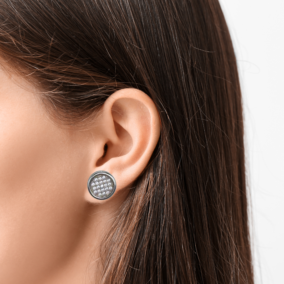 Timeless stud earrings crafted in 925 sterling silver with rhodium plating, featuring a pavé surface of brilliant stones that enhance their radiant shine. Designed with a screw-back closure to ensure a secure and comfortable fit throughout the …