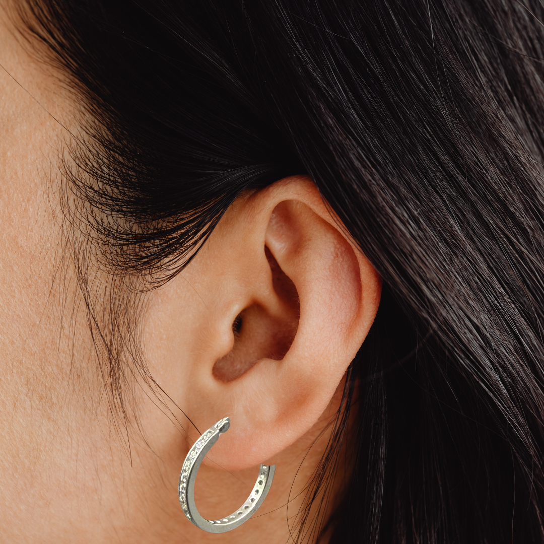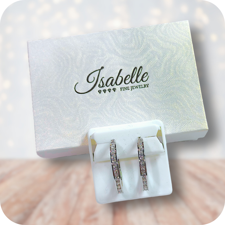 These medium-sized hoop earrings are crafted in 925 sterling silver with rhodium plating, featuring delicate sparkling stones set along the edge for a refined and timeless look. Their balanced size makes them perfect for everyday wear or elegant …
