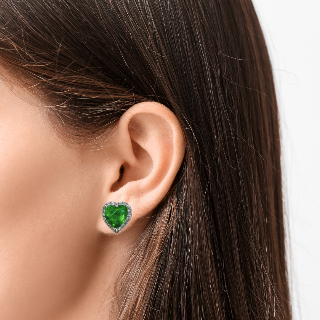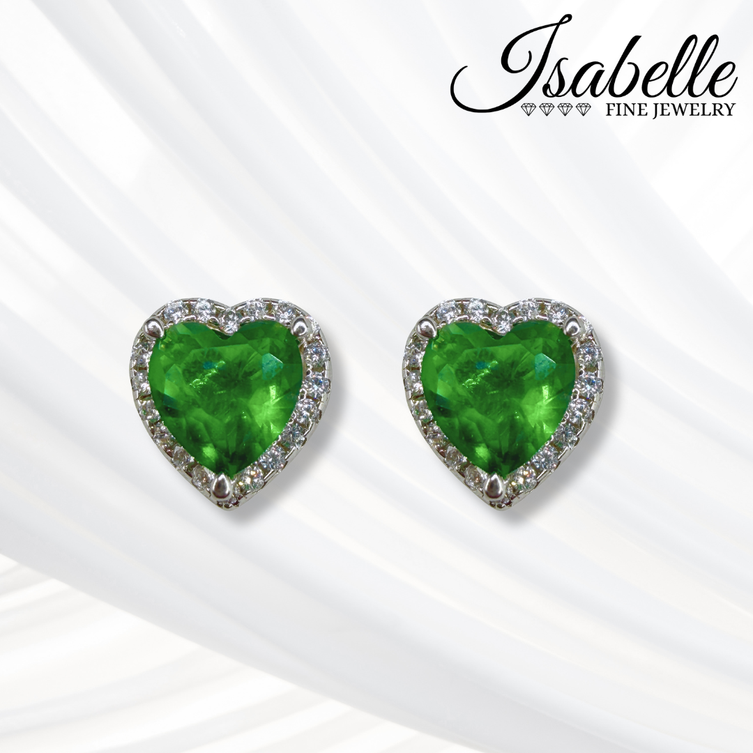 Romantic heart-shaped stud earrings crafted in 925 sterling silver with rhodium plating, featuring a vibrant emerald-green stone at the center and diamond-like stones delicately set along the border. A design that symbolizes love, elegance, and …