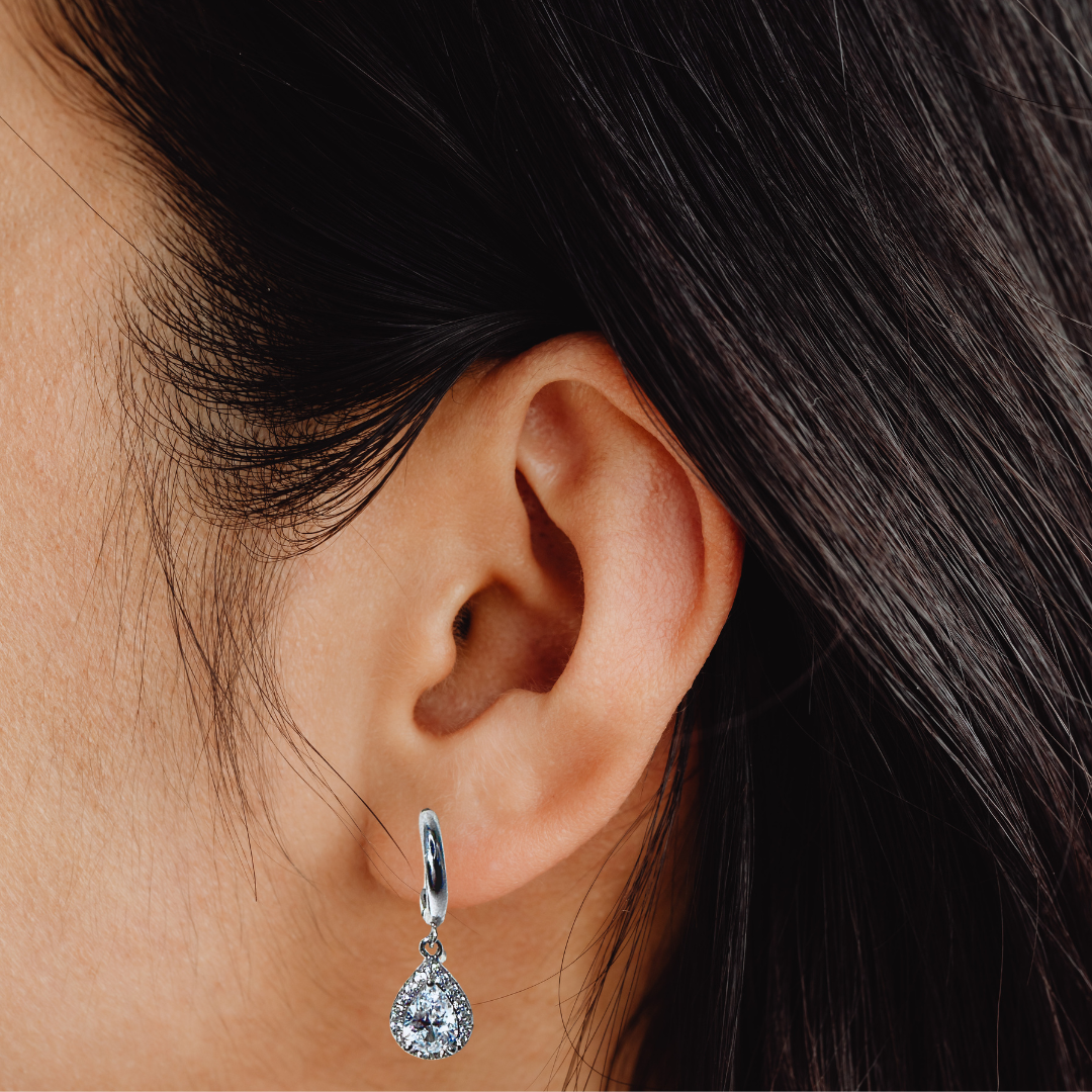 A timeless statement of glamour, these radiant drop earrings feature a brilliant teardrop stone surrounded by delicate sparkle, suspended from polished 925 sterling silver with rhodium plating. Designed to catch every glance, their luminous …
