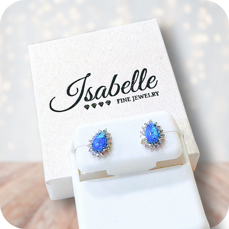 Crafted in 925 sterling silver with rhodium plating, these stud earrings feature a luminous ocean-blue teardrop stone framed by brilliant diamond-like accents. The design evokes the depth and movement of the sea, blending timeless elegance with …